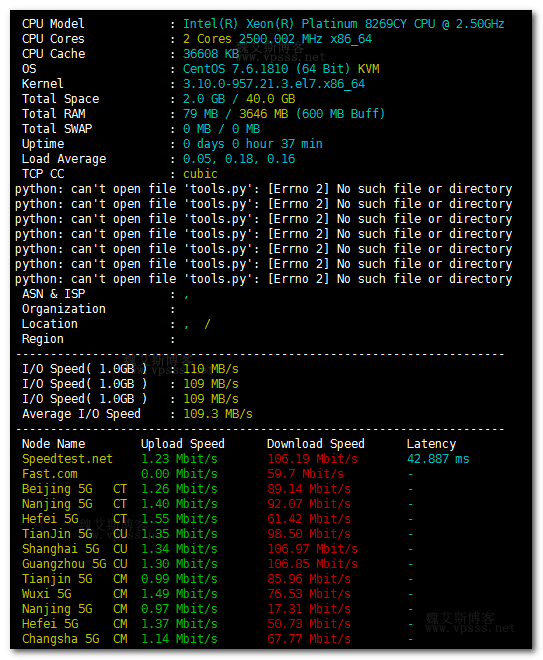 CPU 型号 : Intel(R) Xeon(R) Platinum 8269CY CPU @ 2.50GHz CPU 核心 : 2 核 2500.002 MHz x86_64 CPU 缓存 : 36608 KB 操作系统 : CentOS 7.6.1810 (64 Bit) KVM 内核 : 3.10.0-957.21.3.el7.x86_64 云盘大小 : 2.0 GB / 40.0 GB 内存 : 79 MB / 3646 MB (600 MB Buff) 实例地址 上传速度 下载速度 延时 Speedtest 1.23 Mbit/s 106.19 Mbit/s 42.887 ms Fast com 0.00 Mbit/s 59.7 Mbit/s – 北京电信 1.26 Mbit/s 89.14 Mbit/s – 南京电信 1.40 Mbit/s 92.07 Mbit/s – 合肥电信 1.55 Mbit/s 61.42 Mbit/s – 天津联通 1.35 Mbit/s 98.50 Mbit/s – 上海联通 1.34 Mbit/s 106.97 Mbit/s – 广州联通 1.30 Mbit/s 106.85 Mbit/s – 天津移动 0.99 Mbit/s 85.96 Mbit/s – 无锡移动 1.49 Mbit/s 76.53 Mbit/s – 南京移动 0.97 Mbit/s 17.31 Mbit/s – 合肥移动 1.37 Mbit/s 50.73 Mbit/s – 长沙移动 1.14 Mbit/s 67.77 Mbit/s –