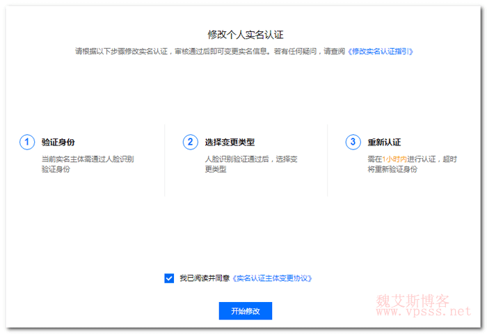 看到修改实名认证的三个步骤,勾选同意后继续。