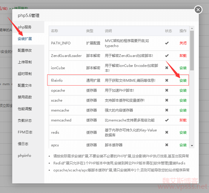 进入 php 管理后,点击“安装扩展”,找到fileinfo 扩展,点击“安装”。后期不用了也可以随时卸载掉。