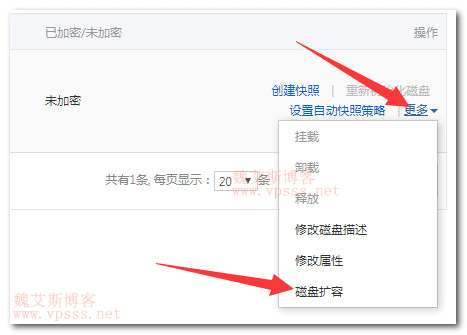 点我进入阿里云控制台的【云服务器】中左侧列表栏,选择【存储于快照】【云盘】,查看要扩容的磁盘大小为 40G,在右侧找到【更多】【磁盘扩容】。