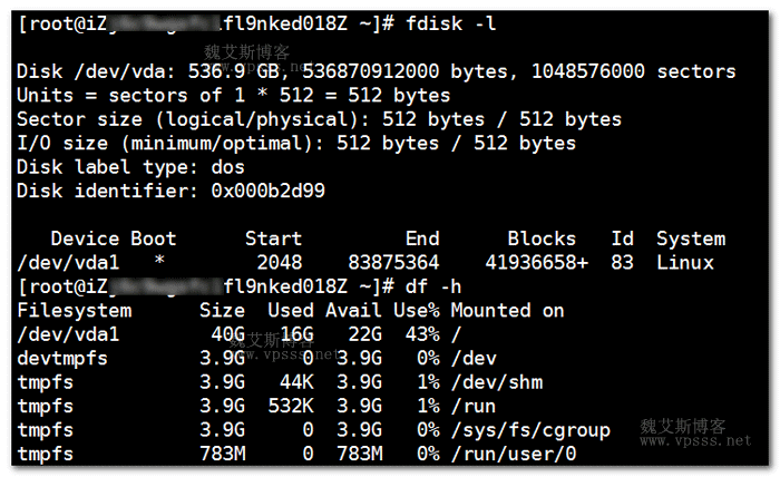 [root@iZfl9nked018Z ~]# fdisk -l Disk /dev/vda: 536.9 GB, 536870912000 bytes, 1048576000 sectors Units = sectors of 1 * 512 = 512 bytes Sector size (logical/physical): 512 bytes / 512 bytes I/O size (minimum/optimal): 512 bytes / 512 bytes Disk label type: dos Disk identifier: 0x000b2d99 Device Boot Start End Blocks Id System /dev/vda1 * 2048 83875364 41936658+ 83 Linux [root@iZfl9nked018Z ~]# df -h Filesystem Size Used Avail Use% Mounted on /dev/vda1 40G 16G 22G 43% / devtmpfs 3.9G 0 3.9G 0% /dev tmpfs 3.9G 44K 3.9G 1% /dev/shm tmpfs 3.9G 532K 3.9G 1% /run tmpfs 3.9G 0 3.9G 0% /sys/fs/cgroup tmpfs 783M 0 783M 0% /run/user/0