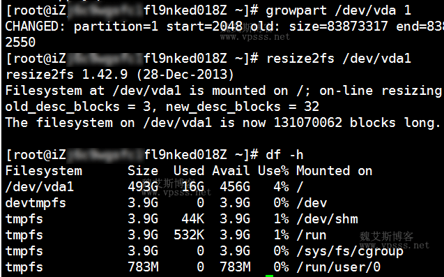 [root@iZfl9nked018Z ~]# growpart /dev/vda 1 CHANGED: partition=1 start=2048 old: size=83873317 end=83875365 new: size=1048560502,end=1048562550 [root@iZfl9nked018Z ~]# resize2fs /dev/vda1 resize2fs 1.42.9 (28-Dec-2013) Filesystem at /dev/vda1 is mounted on /; on-line resizing required old_desc_blocks = 3, new_desc_blocks = 32 The filesystem on /dev/vda1 is now 131070062 blocks long. [root@iZfl9nked018Z ~]# df -h Filesystem Size Used Avail Use% Mounted on /dev/vda1 493G 16G 456G 4% / devtmpfs 3.9G 0 3.9G 0% /dev tmpfs 3.9G 44K 3.9G 1% /dev/shm tmpfs 3.9G 532K 3.9G 1% /run tmpfs 3.9G 0 3.9G 0% /sys/fs/cgroup tmpfs 783M 0 783M 0% /run/user/0
