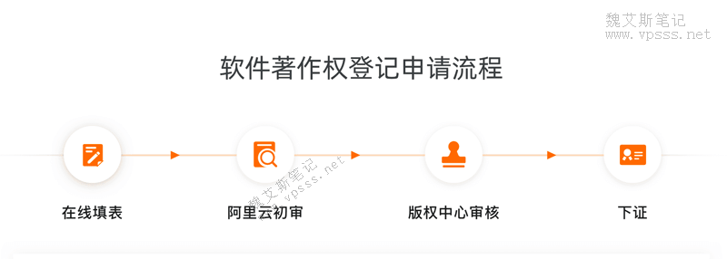 根据下图整个流程比较清晰,先在阿里云在线填表,经过阿里云初审之后,提交到版权中心审核,无误通过后就可以下证了。