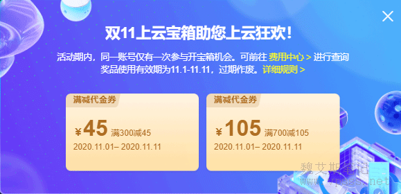 新老用户同享,上云津贴可与部分折扣叠加。老魏领到了满300减45元、满700减105元的的满减代金券,我们买服务器差不多配置也要几百元了,再加上双11活动本身优惠价格,等于折上折。