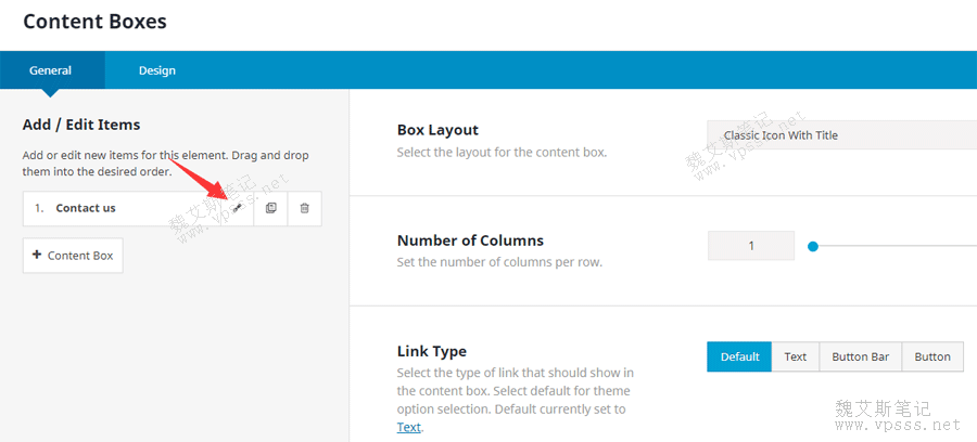 在左侧 1/2 容器中添加 element,选择 Content Boxes,添加地址、电话、邮箱等联系方式。