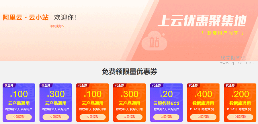 为了方便大家购买,新老用户都可以领取阿里云官方云小站的代金券(新购、复购、升级使用),既然能给我们省钱,没有不领的道理,还有在双11产品购买时可能用到这个代金券,大家往下看。