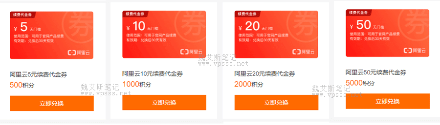 我们一般会去阿里云·云小站领取代金券,不过这里的代金券大多是给新用户或老用户复购使用的,平时看不到续费代金券。这时候老魏发现一个好办法能够领取到续费代金券,就是用我们自己的阿里云会员俱乐部(点我直达)积分兑换续费代金券,面额有四种分别是 5元、10元、20元、50元。