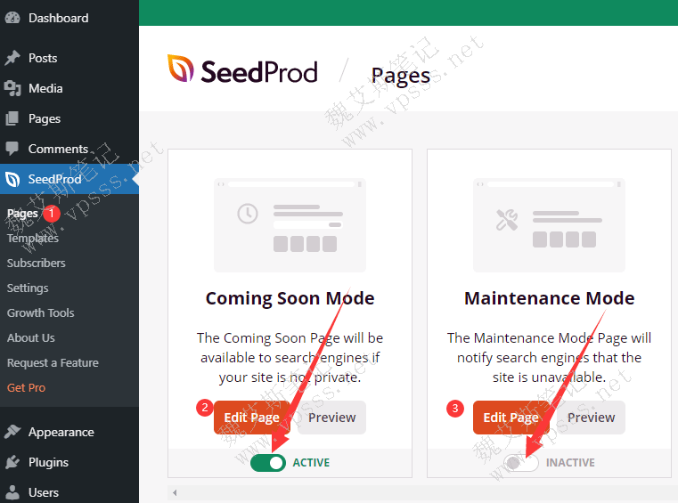 在 WordPress左侧列表中进入 SeedProd > Pages,选择 coming soon mode 或者 Maintenance Mode 都可以。