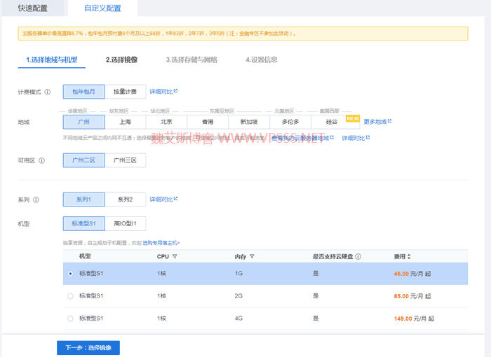A、选择地域与机型中的计费模式有包年包月好按量计费两种,对于广大中小站长来说,选择前者价格相比按量计费更低廉。