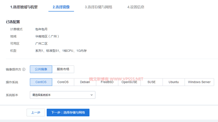 E、选择镜像一般用公共镜像,服务市场里面的镜像需要付费,大部分用户是用不到的。操作系统包括 CentOS/CoreOS/Debian/Ubuntu 等 Linux 系统和 Windows Server 的,看个人习惯用哪个吧,老魏选择了 CentOS7.0 64 位。