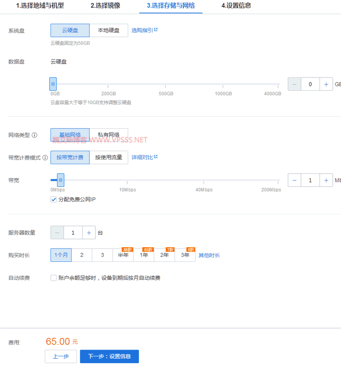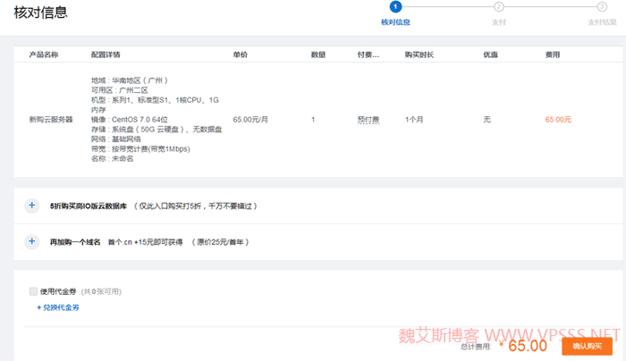 点击立即购买之后,就是核心信息页面,检查一下配置等无误之后,就可以付款了。默认月付 65 元,如果你选择 3 年是 1170 元/36 个月=32.5 元/月,国内每个月 32 元能买到的稳定性高、不需要操心的服务器,真的不多。