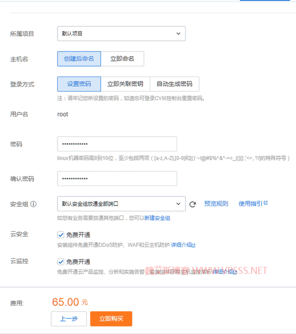 设置信息。主要就是设置 root 密码和安全组。安全组可以自定义也可以用方通全部端口的,这里要提示一下,如果你安装宝塔面板、WDCP 面板等 Linux 面板,或者自行修改过端口,那么就选择放通全部端口,否则会遇到新购腾讯云主机安全组未放行导致网站、数据库无法访问的情况。后面等拿到云服务器了再自行修改更严格的端口设置,可以让服务器安全性更高。