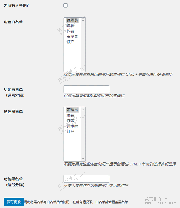 - 功能白名单代表仅显示具有这些功能的用户的管理栏,功能黑名单正反过来,不要为具有这些功能的用户显示管理栏。具体哪些功能老魏没搞明白,不过这两个功能我们也用不上;