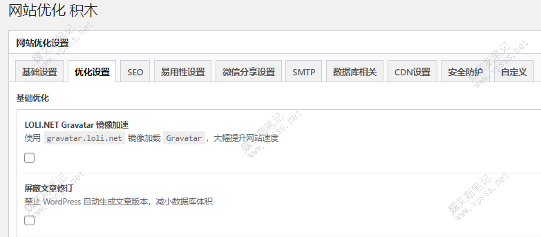 - 优化设置:包括Gravatar 镜像加速、屏蔽文章修订、屏蔽Trackbacks等众多功能。和老魏分享过的WPJAM Basic插件功能类似;