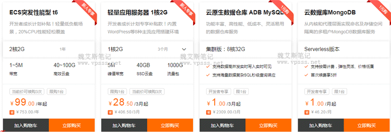- ECS突发性能型t6 2核2G 99元/年;