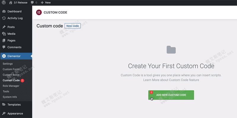 在最新版本的Elementor Pro 3.1中添加了自定义代码新功能,改进了性能(提升页面加载速度),为最受欢迎的代码高亮小部件添加了附加功能,改进了动画标题功能。