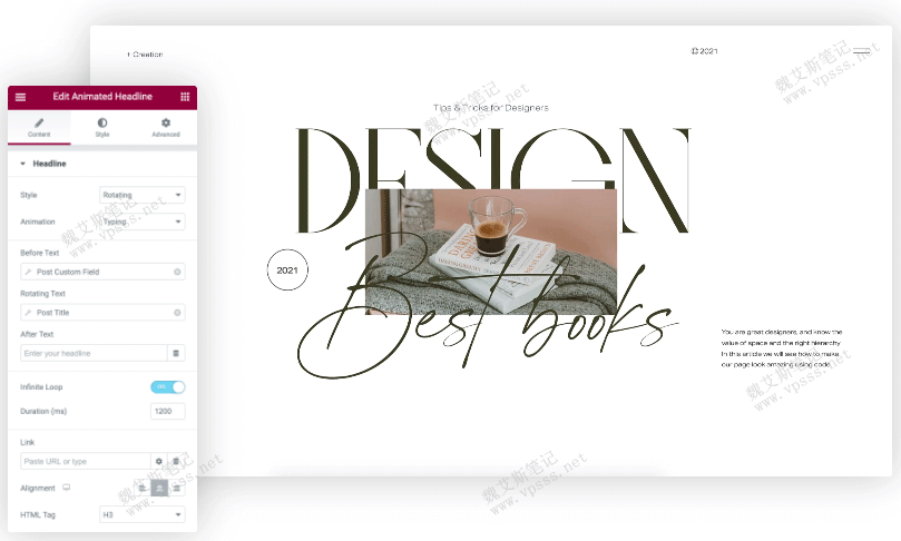 通过控制循环播放,定时等功能创建更多引人入胜的标题。Elementor Pro更新了现有的Animated Headline小部件,可以创建动画和突出显示的标题,从而进一步吸引访问者的注意力。