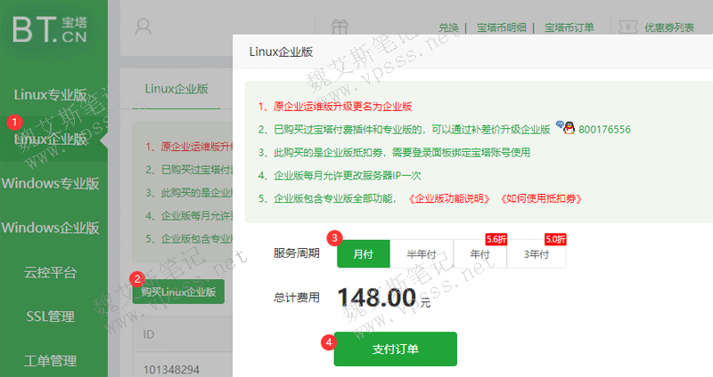 从上图可以看到宝塔Linux面板企业版包括月付、半年付、年付、3年付等方式,不可使用满减优惠券,没有永久授权版,不过官方有大力度折扣。