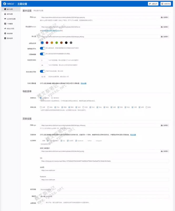 - 页脚设置:页脚Logo,页脚菜单、社交icon、版权信息、备案号及主题信息设置;