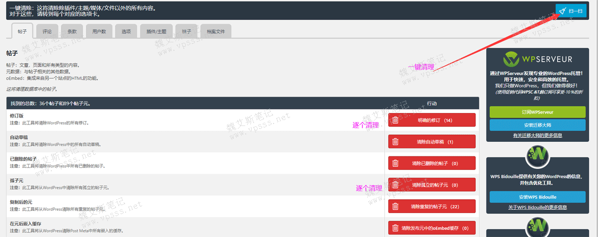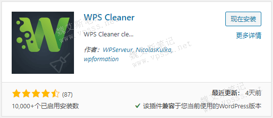从WordPress后台的插件,安装插件进入,搜索“WPS Cleaner”就看到了,安装后启用。