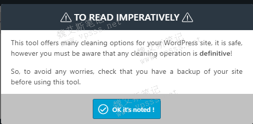 如下图所示是提示在优化数据库之前先要备份网站文件和数据库,点击 ok it’s noted后开始设置。