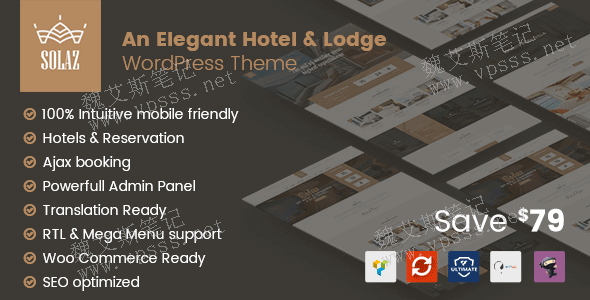Solaz主题是一款WordPress酒店旅馆主题,由themeforest提供在2021年3月份限时免费下载。适用于酒店,汽车旅馆,旅馆,旅馆或住宿加早餐旅馆的WordPress模板。主题页面布局和暖色调的配色额传达了一个舒适友好的外观,通过主题介绍让客人尽享豪华住宿以及专业的客房服务。