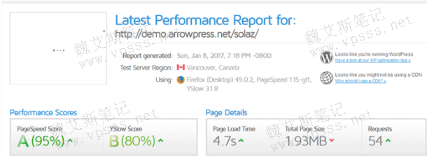 Solaz主题在 Google pagespeed 和YSlow测试得分是A和B,如果再使用缓存加速,相信可以拿到更高分数。