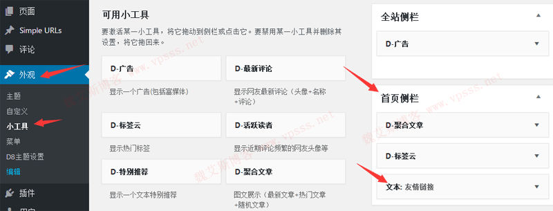1、wordpress 后台的外观-小工具,如果友情链接只在首页显示,就从“可用小工具”中拖拽一个文本到“首页侧栏”。