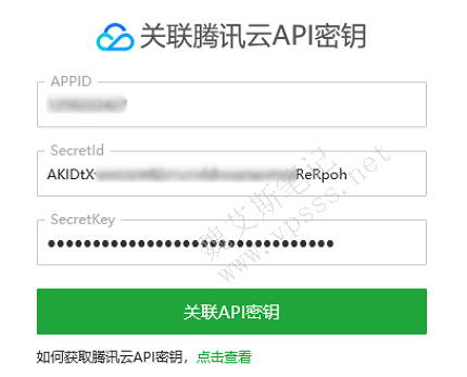 5、弹窗“关联腾讯云API密钥”输入 APPID、SecretId 及 SecretKey,关联腾讯云API密钥。不知道如何获取的朋友请看如何获取腾讯云API密钥APPID/SecretId/SecretKey。