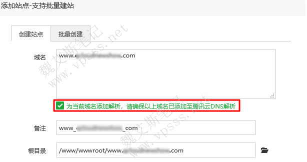 打开宝塔 Linux 面板,左侧进入【网站】,点击【添加站点】,在弹出的“添加站点”窗口勾选“为当前域名添加解析,请确保以上域名已添加至腾讯云DNS解析”,会自动添加解析记录。