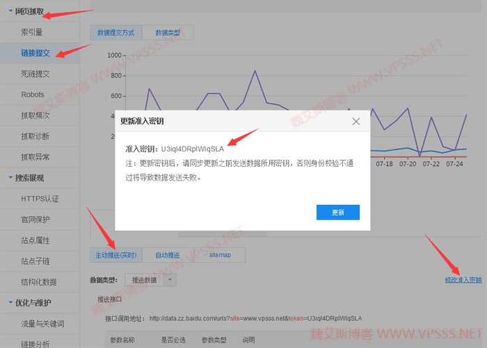 1、话说老魏用了这么久百度站长工具,前几天在网上看到一篇文章说主动推送还要使用准入秘钥效果会更好。不管这个说法是否真实我倒是愿意试试。准入秘钥的位置在这里:百度站长工具的“网页抓取”-“链接提交”-“自动提交”-“主动推送”-“修改准入秘钥”。看下面截图就一目了然了。