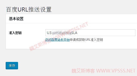 3、安装这个 wp 插件之后你可以在 wordpress 后台的设置中找到。把第一步中的准入秘钥复制粘贴到这里,保存一下即可。上面如果你更新了准入秘钥,一定要把这里的也同步更新一下,推送功能才能正常生效。
