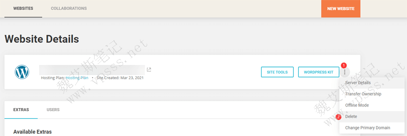 2、在 Website Details 页面的网站域名右侧,点击“竖三个点”按钮,在下拉选项中点击 “Delete”按钮,进入确认信息页面。