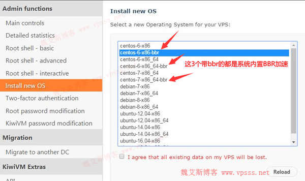 3、购买完毕后,登陆搬瓦工后台,在 kiwivm 面板中,找到 Install new OS,右侧看到带有 bbr 的都是操作系统内置了 BBR 加速的,*86 代表 32 位系统;_64 代表 64 位系统,一般来说 64 位系统运行效率会高一些,我个人会选择 centos-7-*86_64-bbr,当然了这个不是绝对的,以你的选择的操作系统的实际体验效果为准吧。选择好了之后,点击下面的 Reload 就可以安装了。