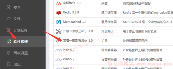 宝塔一键部署源码这个功能位置在宝塔面板后台的“软件管理”中,作用是快速部署常用程序。想要使用这款插件需要把右侧的开关打开,也就是向右拖动为绿色状态。