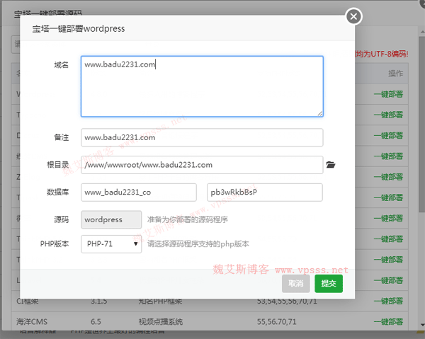 比如我选择第一个 wordpress 程序,一键部署后弹出添加域名、根目录、数据库、PHP 版本的选项。输入完毕后,点击提交。
