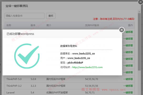 弹出添加网站成功,正在下载程序和已成功部署 wordpress 的提示。