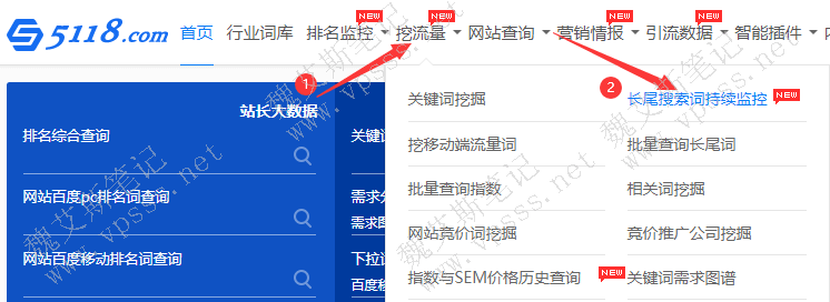 3、点击直达5118网站首页 > 从导航菜单进入“挖流量” > “长尾搜索词持续监控”进入“长尾与流量监控”。