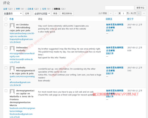 有天早上起来看到后台被人灌了 6 篇英文垃圾评论,我气就不打一处来。明知道是群发软件干的也无可奈何。后来发现垃圾评论只针对一篇文章而发,就是:如何设置免费网易企业邮箱,大概是因为标题中带有邮箱二字被软件扫描到盯上了,而这文章发布已久又不适合再改了。
