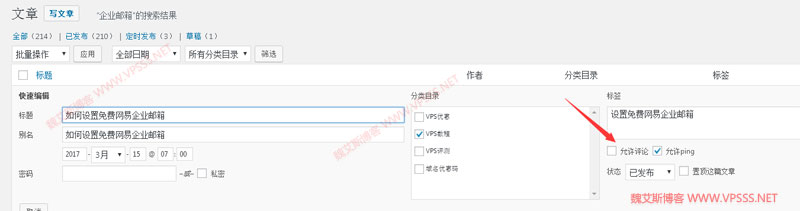 于是再次搜索了一下解决办法,思路从禁止 wordpress 英文评论,变成了禁止 wordpress 某篇文章评论,你别说还真找到一个办法。就是在 wordpress 后台找到要禁止评论的文章,将鼠标移到文章标题上可以看到出现了四个文字链接可以对文章进行操作。选择“快速编辑”,把允许评论的对勾去掉,点击下面的“更新”。