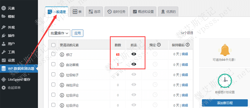 从 WordPress后台的 WP DB Cleaner进入,右侧的一般清理,先勾选要清理的元素。