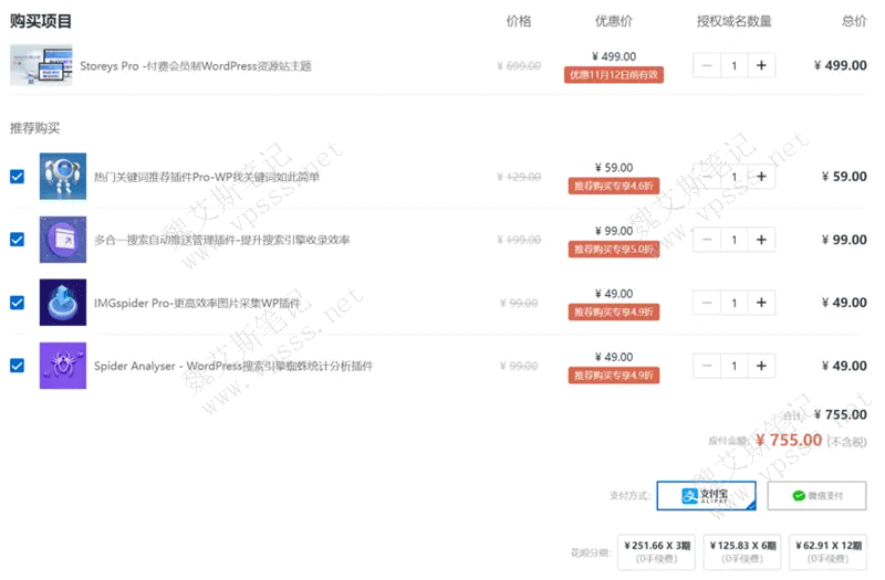 享受主题加购插件优惠,在购买主题时,在下方勾选需要的插件,即可享受插件加购优惠。如下图所示: