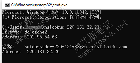 - Windows平台按键盘的视窗键 win+R,在运行中输入cmd,回车后看到命令行窗口,使用nslookup ip命令反向解析 ip 判断对方是否是来自 Baiduspider 的抓取。