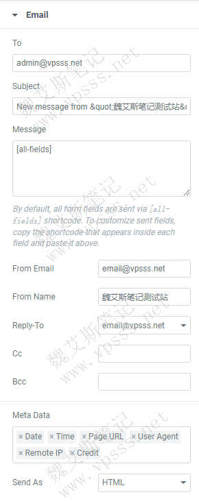 Reply to:当你收到系统通知邮件,点击回复时,应该回复给哪个邮箱。这里通常选择 email field,也就是填写表单的客户。