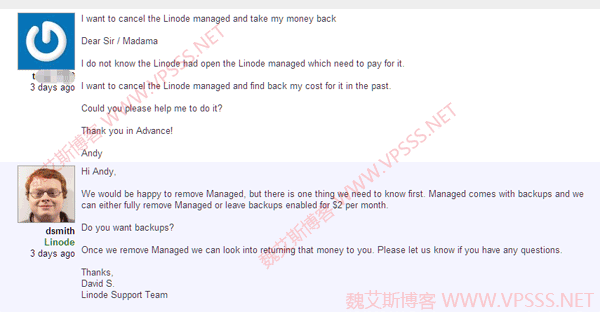 为了方便有同样遭遇的网友,魏艾斯博客把自己的工单内容贴出来,有需要可以拿去用。大概意思就是让客服帮忙取消 managed、backups,并把扣掉的费用返还。