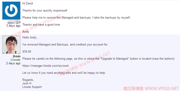 经过一番和客服的工单交涉,Linode 也很痛快的停止了 managed、backups,并返还了相关费用,总体来说整个过程并不麻烦。