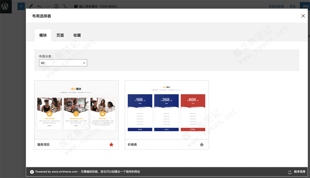 使用页面模块构建网站布局,利用古腾堡编辑器实现了的所见即所得功能,插入预设好的单个模块或整个页面,再替换成你自己的图片、文字即可。