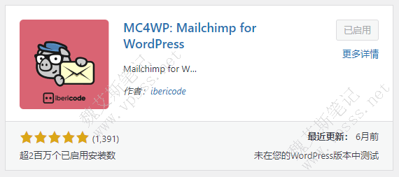 在 WordPress>插件>安装插件,搜索“Mailchimp”,相关插件比较多,如果是下图的名字和安装数量就对了。