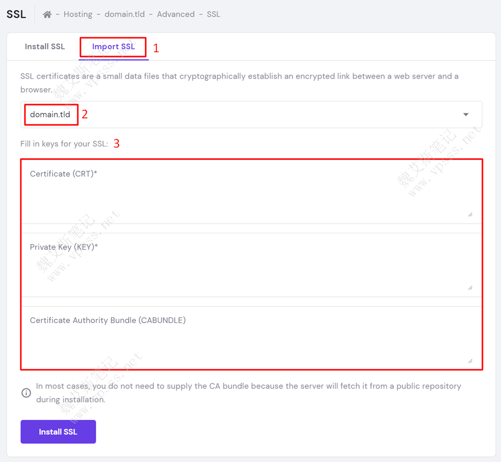 2、点击 Import SSL,选择要安装证书的域名,打开你本地下载好的域名密钥、证书,把里面的值粘贴到下面。