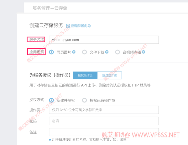 4、输入[服务名称],并为该服务创建或授权操作员,点击[创建],云储存服务创建成功